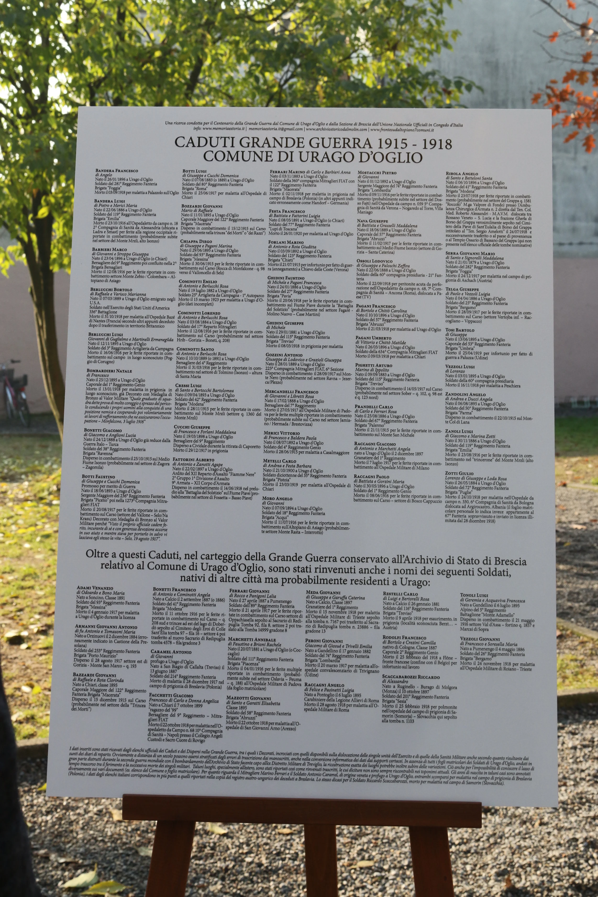 La seconda edizione della mostra è stata portata dalla Sezione UNUCI di Brescia al Comune di Urago d’Oglio - con il quale è stato instaurato uno splendido rapporto di collaborazione - grazie al coordinamento del Sindaco Avv. Antonella Podavitte e con il supporto tecnico della Giunta. La mostra viene ospitata a Urago nella prestigiosa location di Villa Zoppola-Martinengo, secondo principale antico edificio dopo il castello trecentesco attorno al quale si è sviluppato nei secoli il borgo che si è poi esteso con l’attuale abitato. Villa Zoppola, con uno splendido parco, nella parte adiacente modernamente ristrutturata, ospita oggi la Scuola Media e i suoi oltre centocinquanta studenti; alle classi Terze la mostra sarà presentata in anteprima tramite una conferenza a tema a sfondo letterario e fotografico. La sincera condivisione del Centenario della Grande Guerra con il Comune di Urago d’Oglio vedrà anche, durante la concessione di una serie di Borse di Studio istituite dall’Amministrazione, la consegna di una copia del nostro libro “Il Milite Ignoto” ai ragazzi più meritevoli durante un incontro pressso la Sala Civica nel quale saranno proposta anche immagini della Grande Guerra oltre alla storia di alcuni Caduti del paese nel primo conflitto mondiale. Si ringrazia lo staff tecnico del Comune di Urago d’Oglio e l’intera Giunta con tutti i suoi collaboratori tecnici grazie alla cui professionalità è stato possibile realizzare questi eventi (servizio foto video Camillo Mazzoleni - Life Video Foto Brescia e Massimo Gozzini - Urago d’Oglio). Si ringrazia inoltre il Prof. Riganò - Ten. dell’Arma di Artiglieria in Congedo, docente di matematica della Scuola “S. Quasimodo” di Urago d’Oglio per l’attivo coordinamento e la Fanfara dei Bersaglieri di Orzinuovi per la sfilata di domenica 2 dicembre.