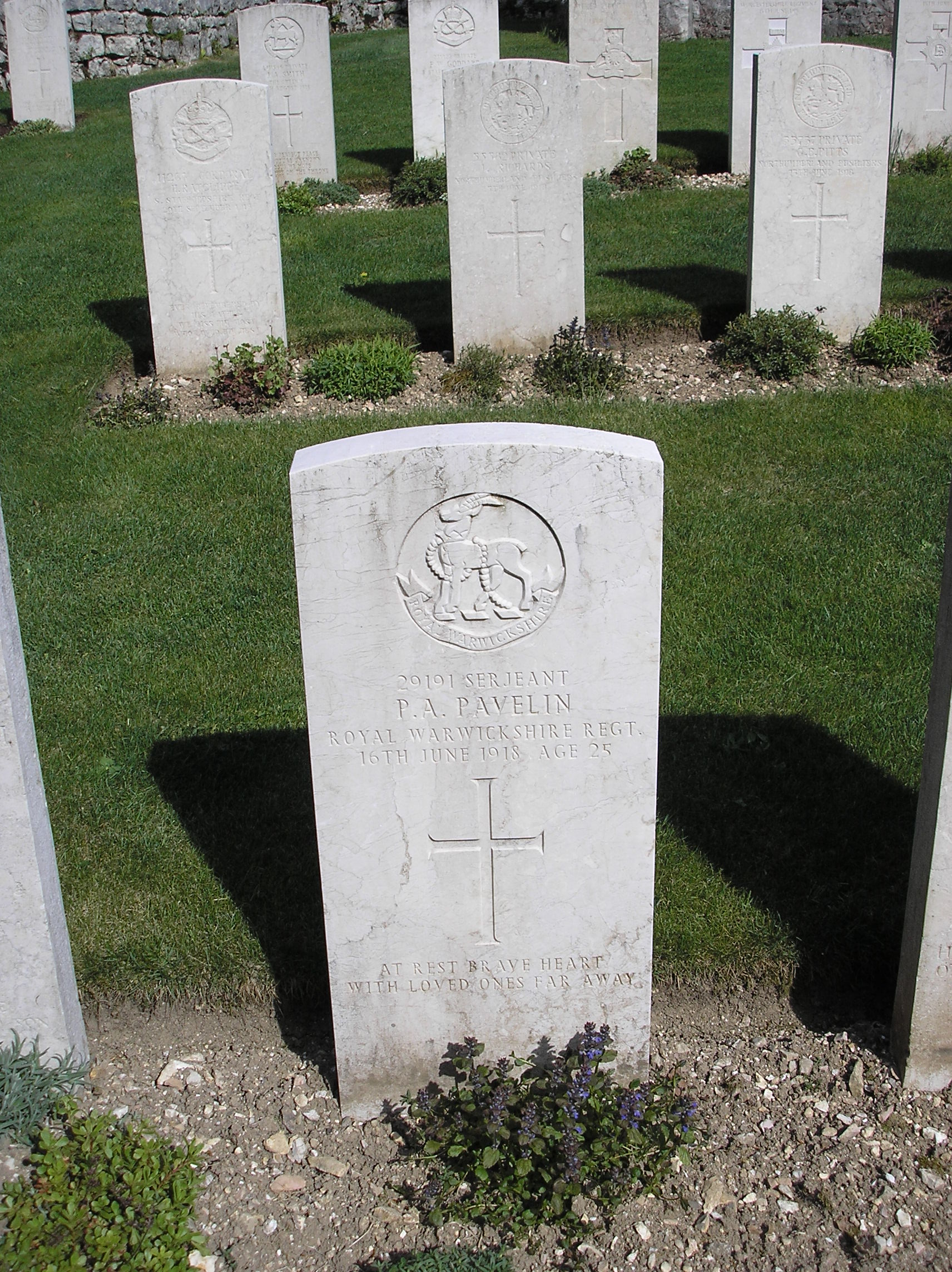 PAVELIN, Serjeant, PERCY ALBERT, 29191, 1st/6th Bn., Royal Warwickshire Regiment. 16 June 1918. Age 25. Son of George and Elizabeth Ann Pavelin, of Barking. Grave Ref. Plot 2. Row D. Grave 2.