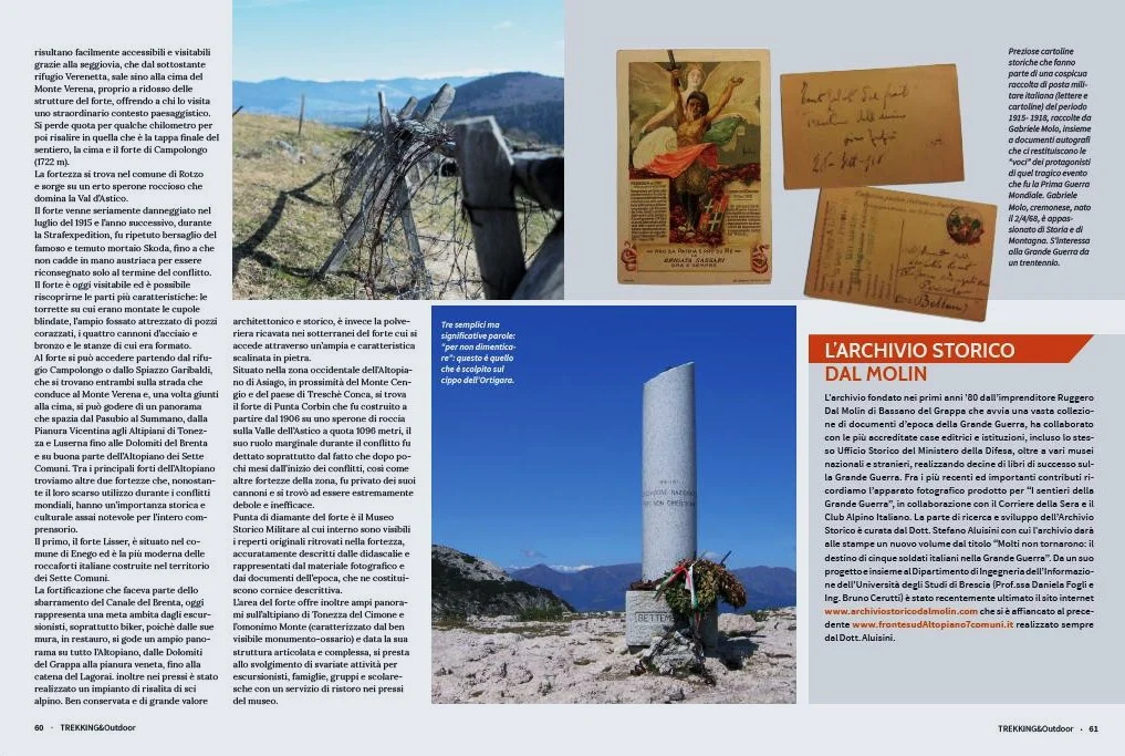 Dalla bellissima rivista bimestrale TREKKING&OUTDOOR n. 277 – aprile 2015 – “I sentieri della Grande Guerra: Speciale Altopiano di Asiago”. Articoli di Fabio Guglielmi e Severino Ripamonti. Fotografie di Mirko Carollo, Unione Montana Spettabile Reggenza dei Sette Comuni, Marco Cavazza, Denis Lunardi, Archivio Storico Dal Molin (Ruggero Dal Molin e Stefano Aluisini).