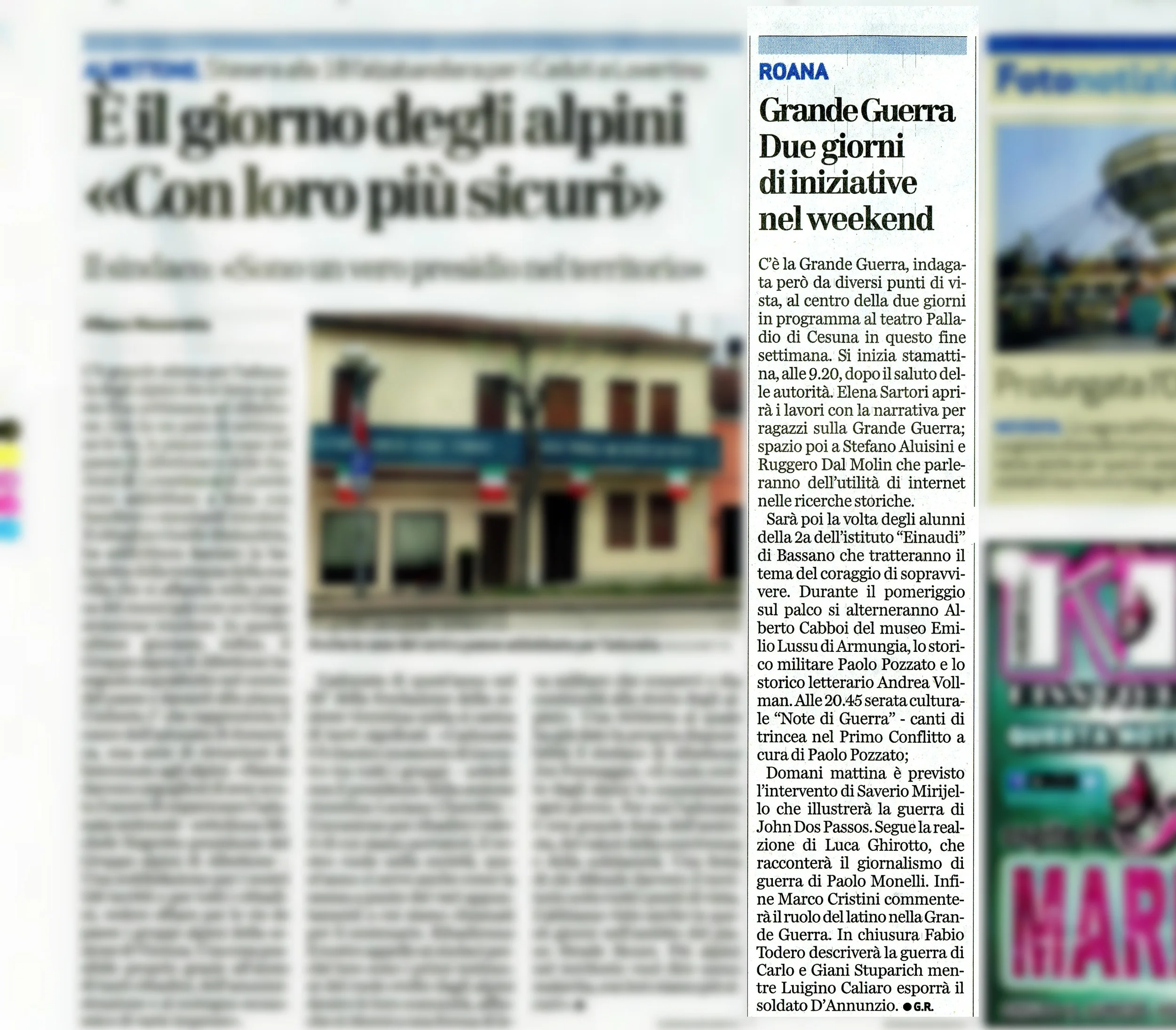 “Frammenti della Grande Guerra” a Bassano del Grappa, mostra tematica curata da Paolo Pozzato e Ruggero Dal Molin; nel quadro della medesima iniziativa che ha coinvolto anche il Museo Ca’ Erizzo – Luca, l’incontro presso la Biblioteca Civica del 28 ottobre 2016 con Stefano Aluisini e Ruggero Dal Molin (autori insieme a Marco Cristini de “La Croce in trincea” – Itinera Progetti) – da “Il Giornale di Vicenza” del 25 ottobre 2016 (nella galleria a scorrimento anche alcune immagini degli ultimi preparativi alla vigilia dell'inaugurazione).