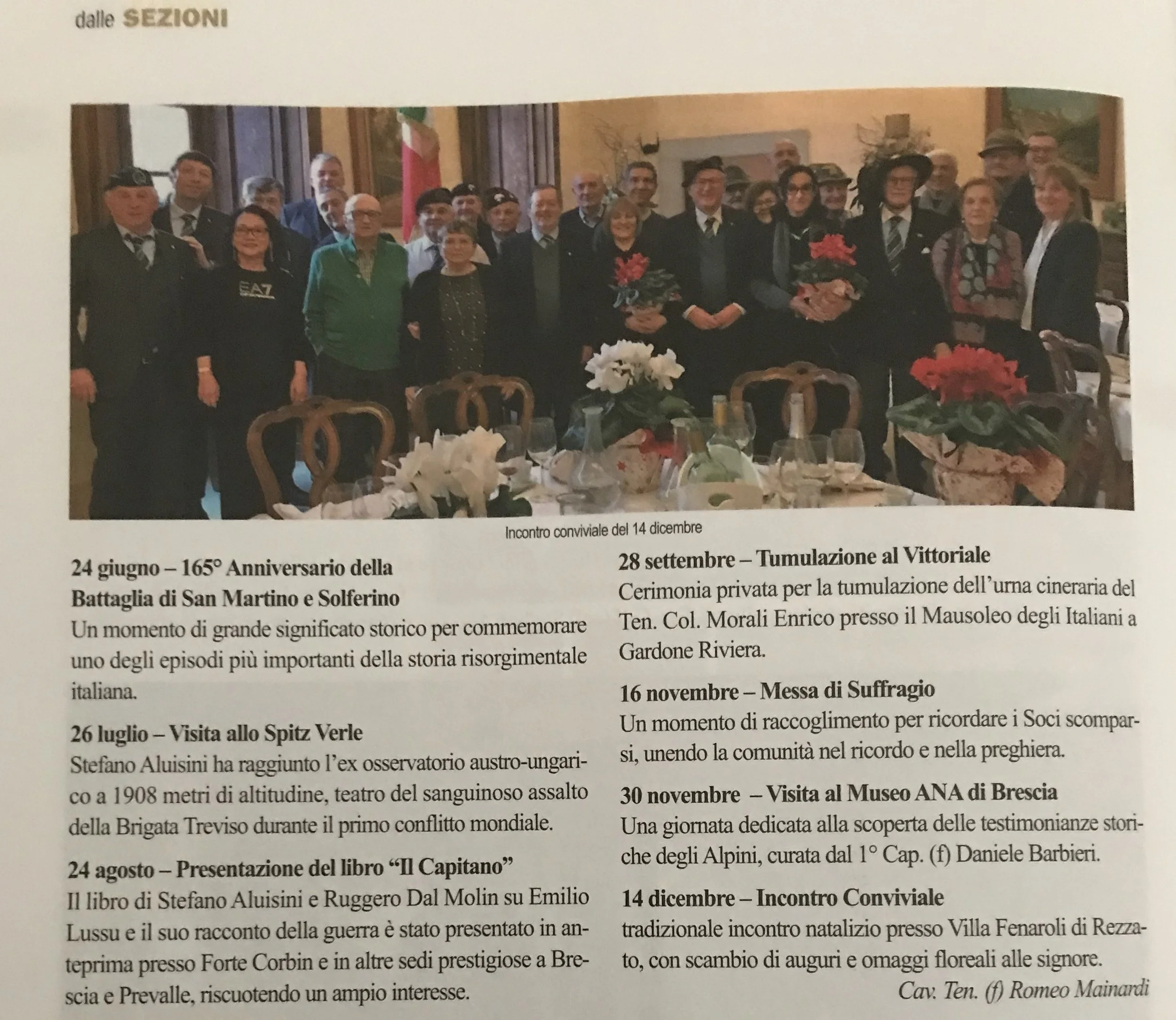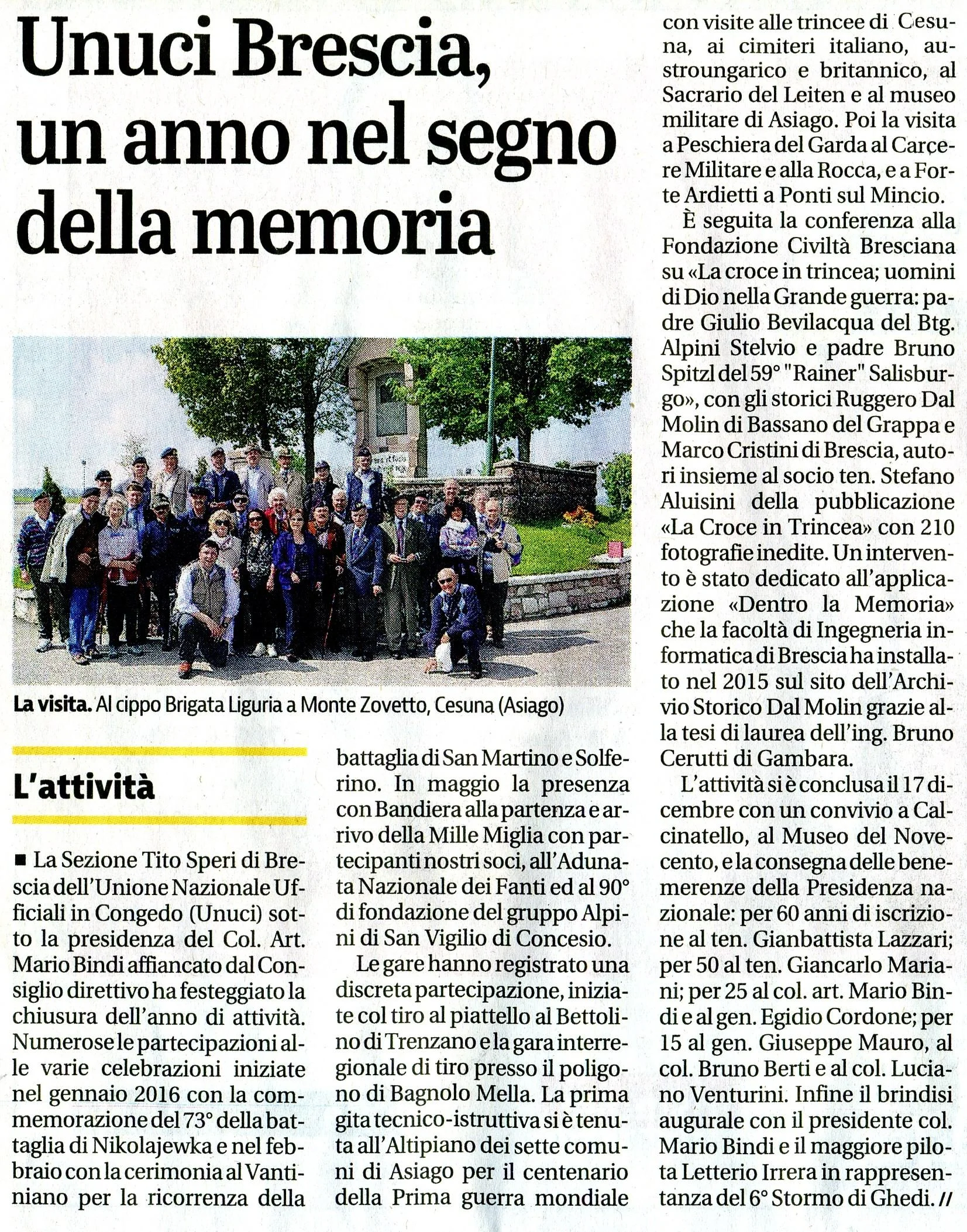 Le attività 2016 della Sezione di Brescia dell’Unione Nazionale Ufficiali in congedo d’Italia hanno visto tra i protagonisti l’Archivio Storico Dal Molin con il fondatore Ruggero, Stefano Aluisini e Marco Cristini con i quali sono state organizzate la visita sull’Altopiano di Asiago e la conferenza del novembre 2016 (dal Giornale di Brescia del 8 gennaio 2017).