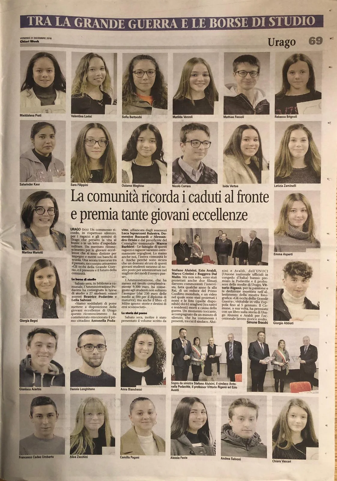 La cerimonia delle Borse di Studio con la consegna del libro “Il Milite Ignoto” di Stefano Aluisini, Ezio Avaldi, Marco Cristini e Ruggero Dal Molin ai ragazzi delle Scuole Medie e Superiori di Urago d’Oglio (BS).
