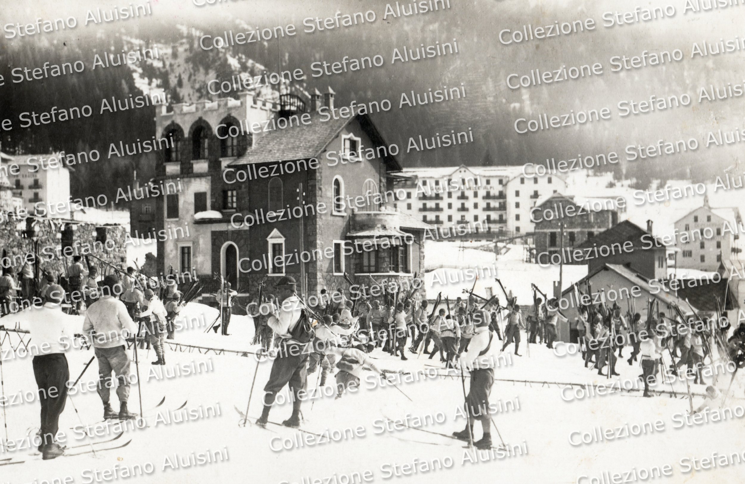 Anni Trenta: Finanzieri della Scuola Alpina Regia Guardia di Finanza di Predazzo giunti a San Martino di Castrozza con gli sci (Collezione Stefano Aluisini).