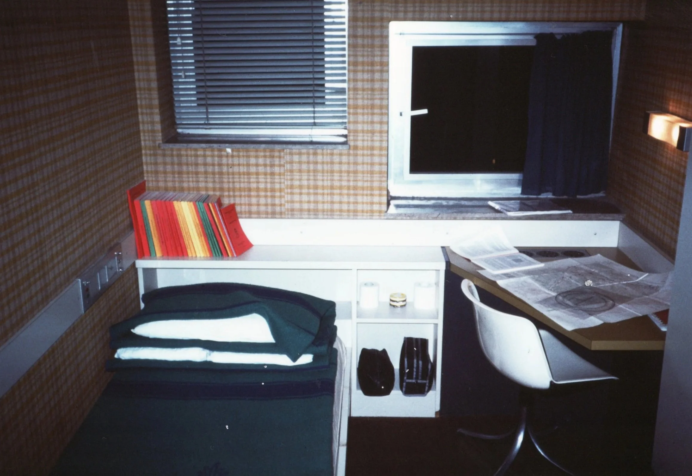 La mia stanza (a 2) presso la Compagnia Corsi Speciali dell’Accademia della Guardia di Finanza di Bergamo durante il 35° Corso Allievi Ufficiali di Complemento “Ermes” (1991-1992); con alcuni “classici” (le sinossi, il lucido da scarpe nero nella scatolina metallica, le lenzuola e le coperte “a mezzo cubo”, etc.) si capisce che quel giorno stavamo studiando topografia. All’epoca l’Accademia (che allora ospitava i Corsi Ordinari del 1° e 2° anno e i Corsi Speciali AUC e MAU), aveva sede nell’ex Istituto (Campus) San Marco di Via Statuto a Bergamo poi trasferitasi negli anni 2000 nell’ex complesso degli Ospedali Riuniti di Largo Barozzi, opportunamente ristrutturato.