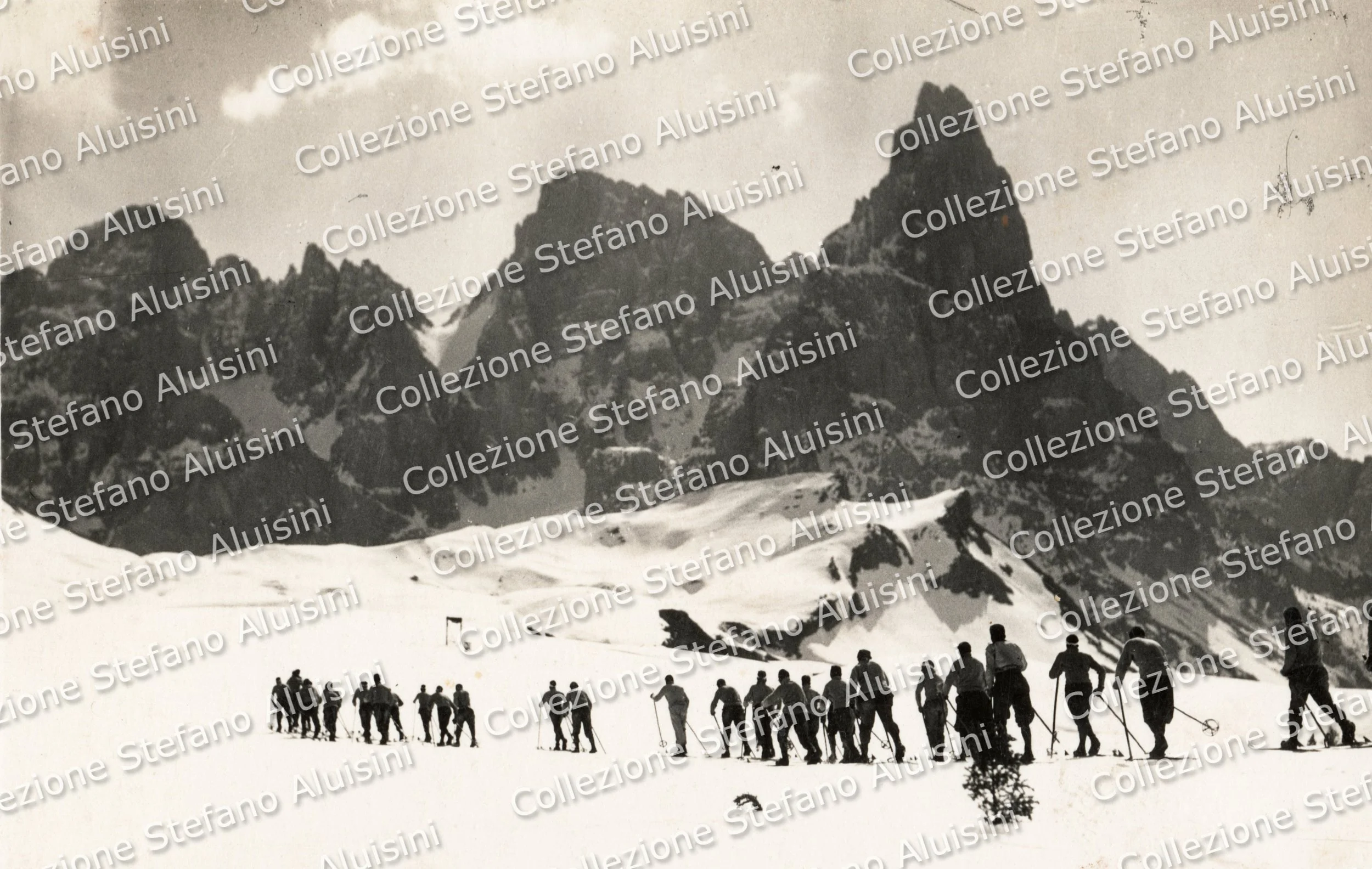 Sciatori della Scuola Alpina Regia Guardia di Finanza di Predazzo in marcia con gli sci in direzione di Passo Lusia ritratti in una fotografia degli anni Trenta (Collezione Stefano Aluisini).