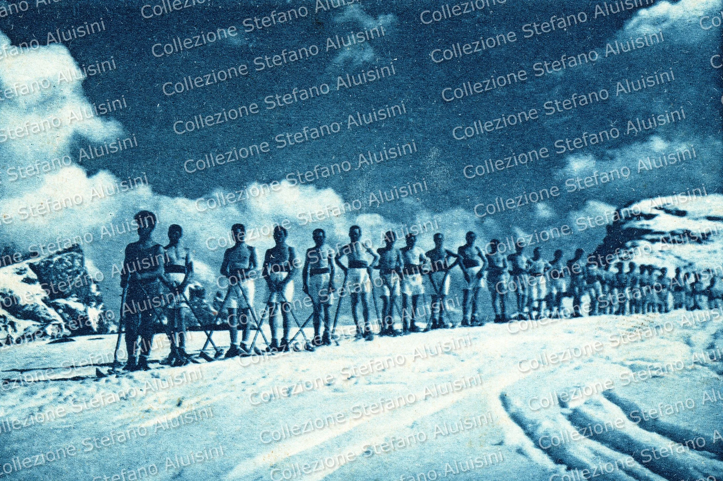 Splendida e iconica cartolina dedicata al distaccamento sciatori della Scuola Alpina della Regia Guardia di Finanza di Predazzo realizzata negli anni Trenta (Collezione Stefano Aluisini).