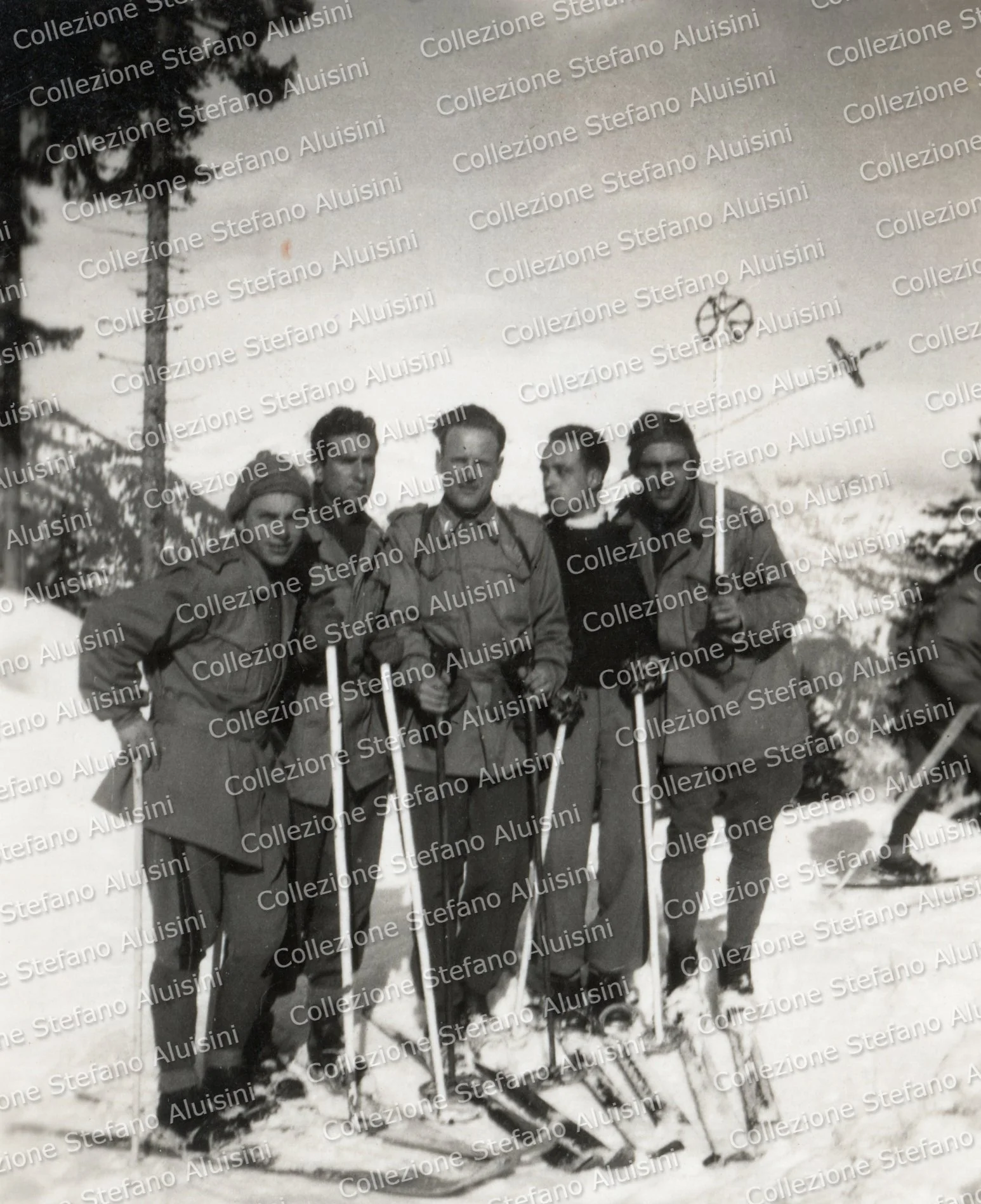 Uscita con gli sci sul Monte Malgola per alcuni Finanzieri della Scuola Alpina della Guardia di Finanza di Predazzo nel gennaio del 1946 (Collezione Stefano Aluisini).