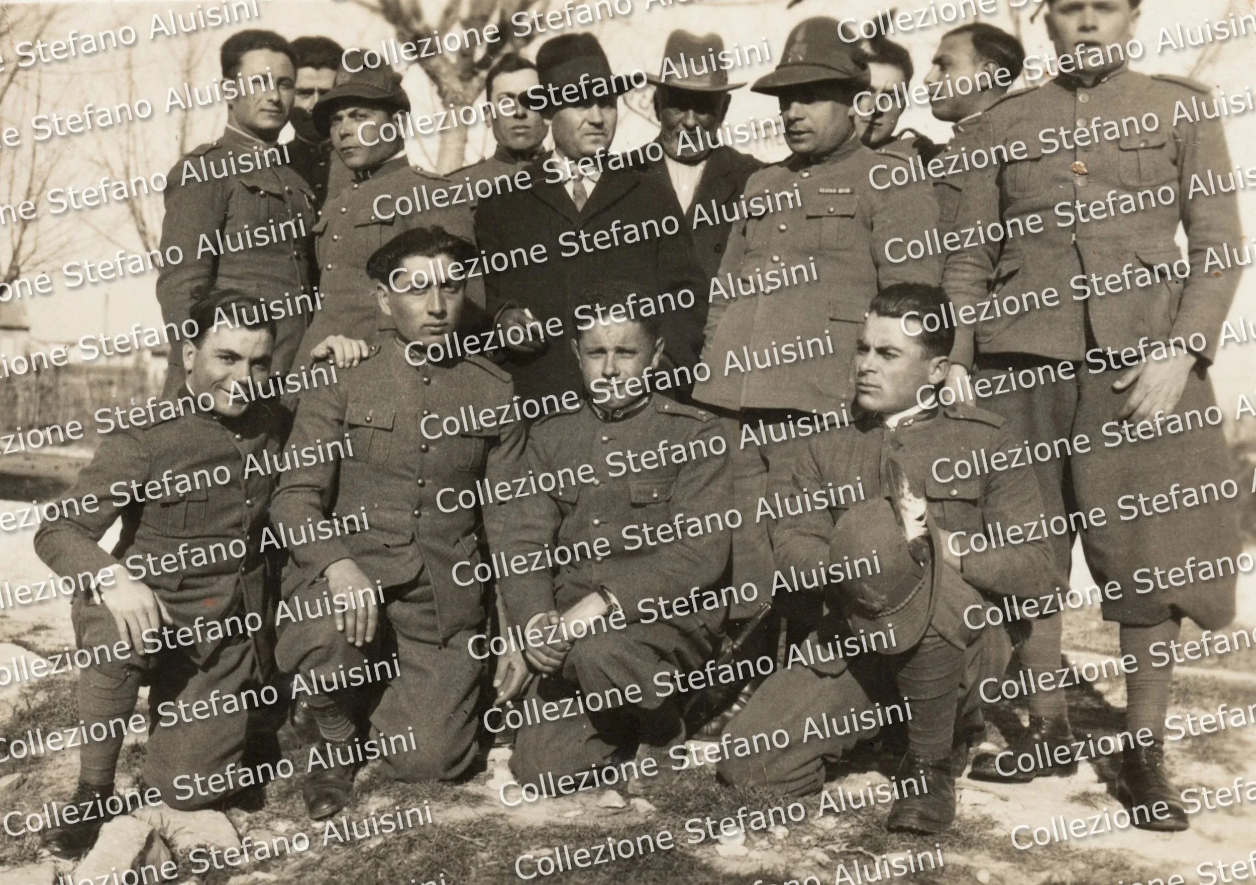 Gruppo di Finanzieri ritratto attorno a colui che pare essere invece un militare del Regio Esercito, seduto al centro, con le mostrine del colletto a due colori, insieme a due civili in piedi dietro di lui. Luogo ed epoca sconosciuti. Alle loro spalle, in alto, si intravede parte di una scritta, forse un cartello stradale (si legge solo un iniziale: “TRE…”). Notare la penna mezza bianca sul cappello alpino del Finanziere seduto a destra. Una fotografia senza tempo dove ogni volto pare volerci raccontare la sua storia dal passato (Collezione Stefano Aluisini).