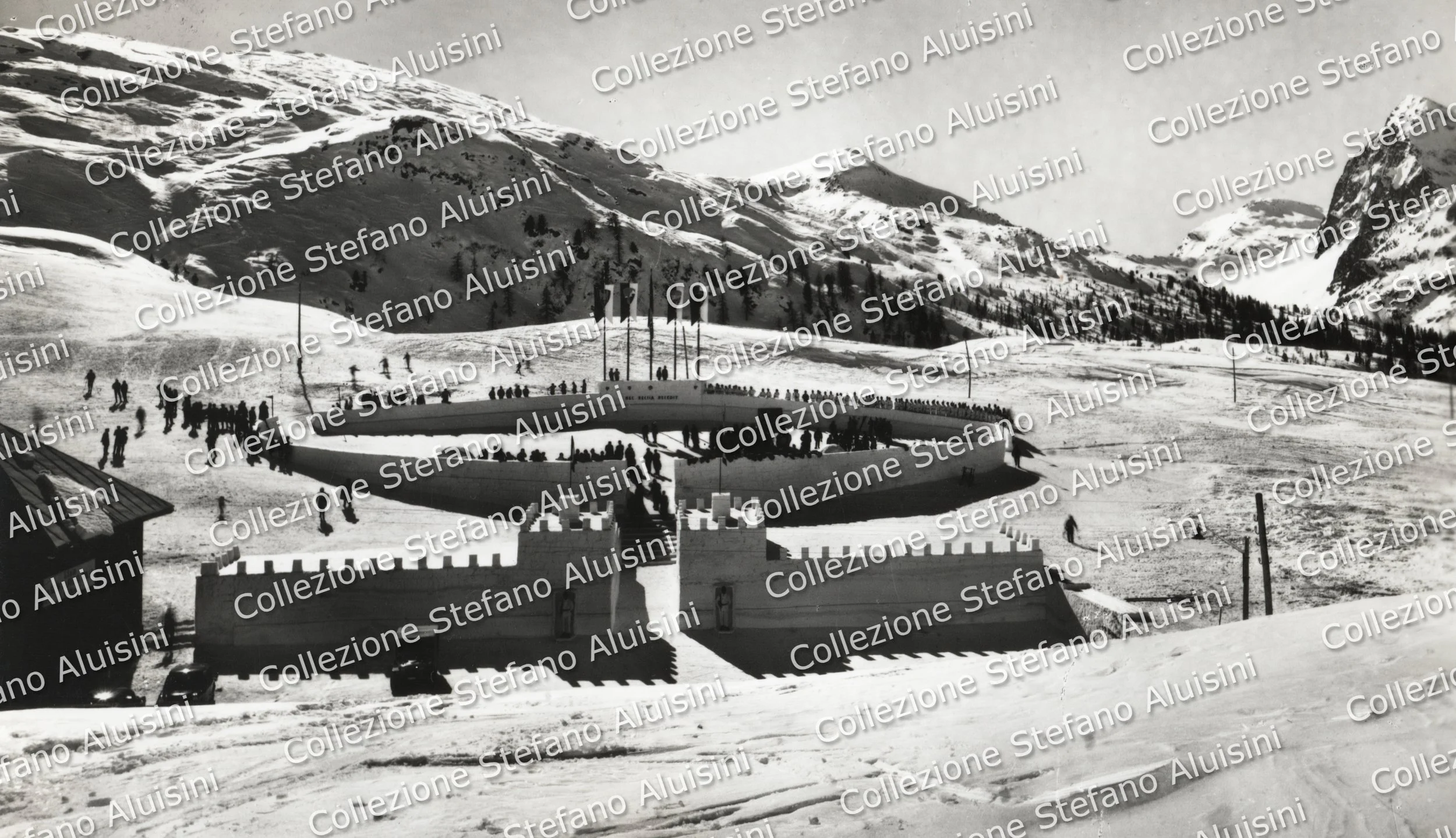 Stadio della neve realizzato dalla Scuola Alpina di Predazzo per le gare invernali della Guardia di Finanza a Passo Rolle, anno 1961 (Collezione Stefano Aluisini).