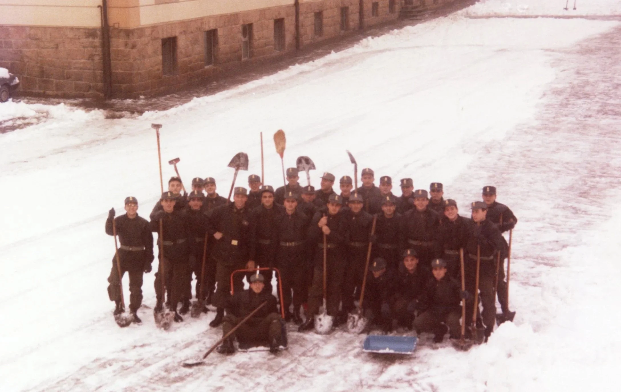 8 dicembre 1992: “volontari” della 3a Compagnia del 62° Corso “Val Visdende” incaricati di spalare la neve dal piazzale della Scuola Alpina della Guardia di Finanza di Predazzo.
