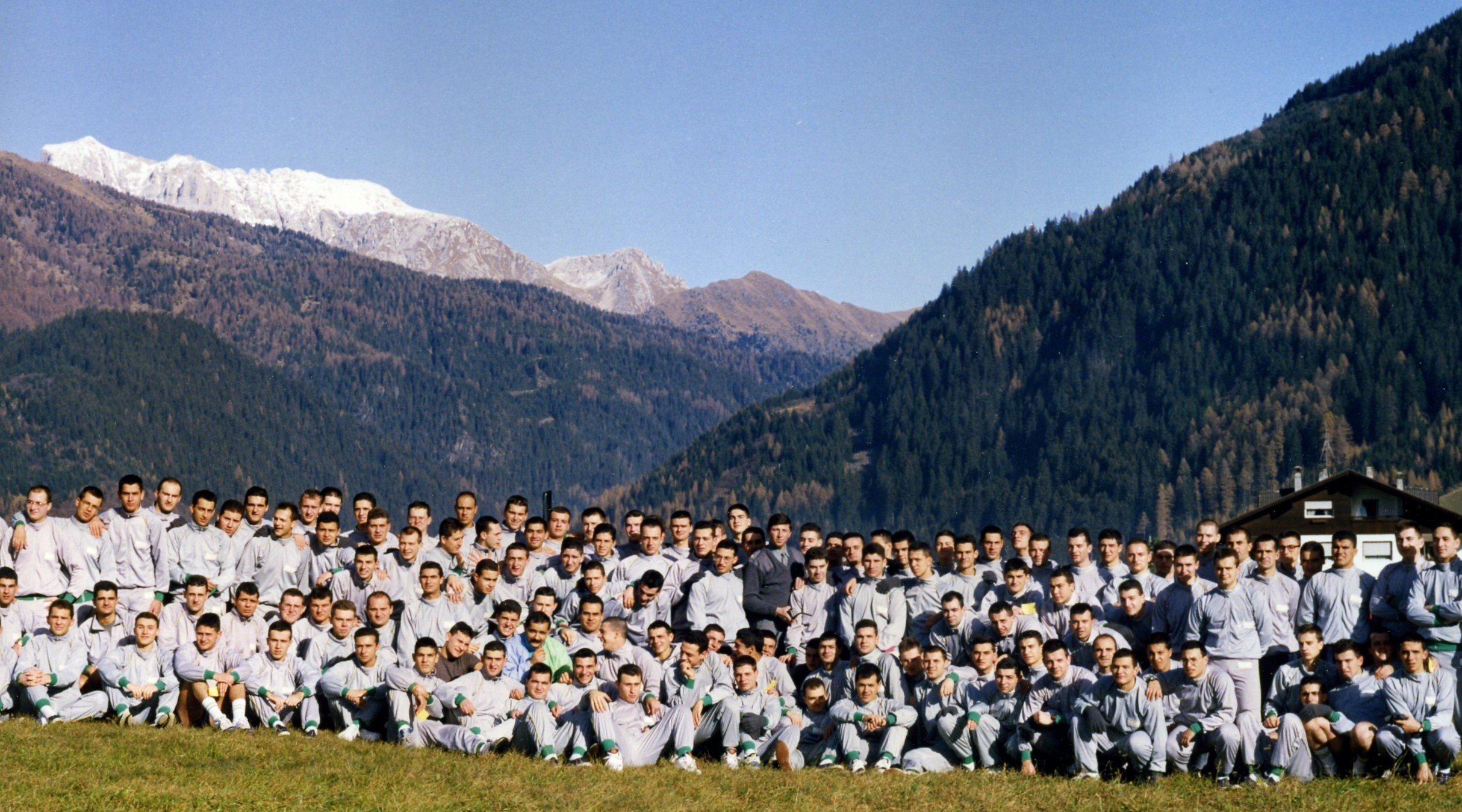 La 3a Compagnia Sciatori della Scuola Alpina di Predazzo - 62° Corso “Val Visdende”, ritratta all’inizio del corso in un prato adiacente la caserma (ottobre 1992).